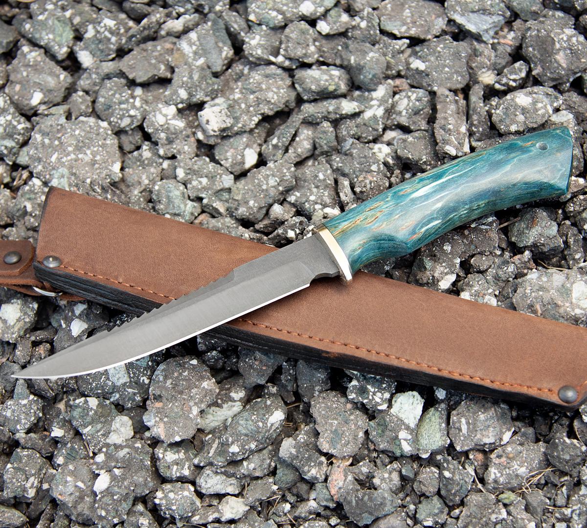Нож Рыбак из булатной стали, рукоять - стабилизированная карельская береза, кожаный чехол идет в комплекте.