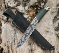Нож Сибиряк из булатной стали с травлением, рукоять - стабилизированный дальневосточный ясень, кожаный чехол в комплекте.