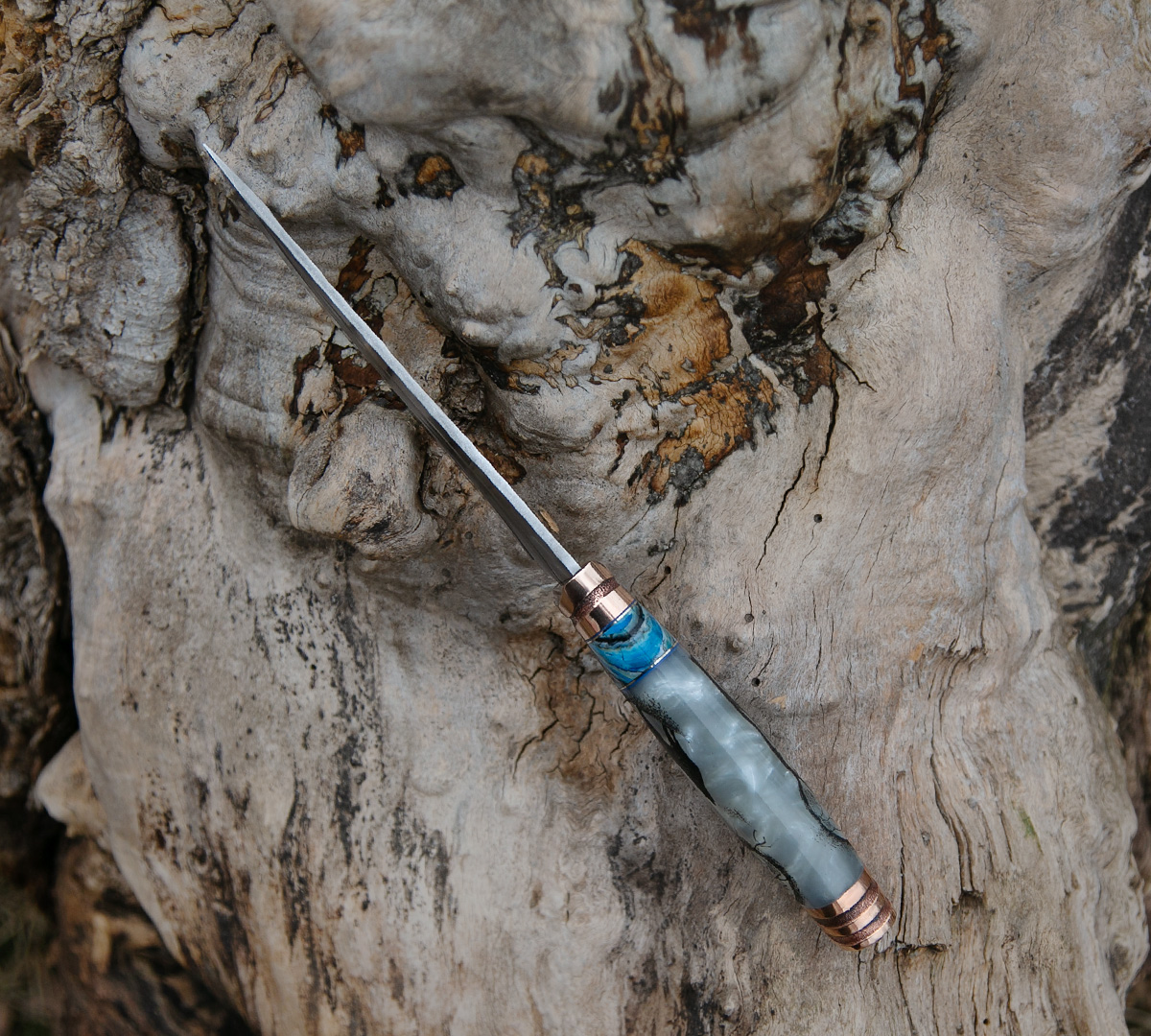 Нож Клыч из дамасской стали, рукоять - акрил + зум мамонта (скрим шоу), кожаный чехол в комплекте.