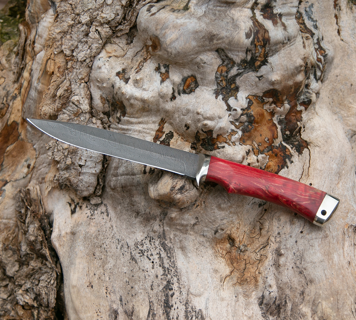 Нож Олимп из дамасской стали, рукоять - стабилизированная карельская береза, кожаный чехол в комплекте.