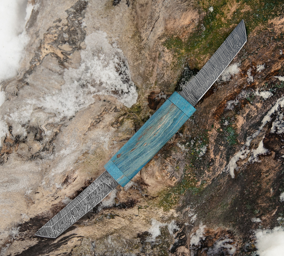 Нож Танто с двойным клинком из дамасской стали в деревянных ножнах, рукоять и ножны - стабилизированная карельская береза.