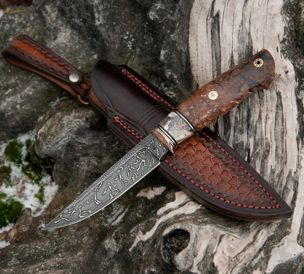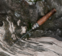 Нож Ладья из мозаичной дамасской стали, рукоять - шпальт, стабилизированный зуб мамонта. Формованный чехол идет в комплекте.
