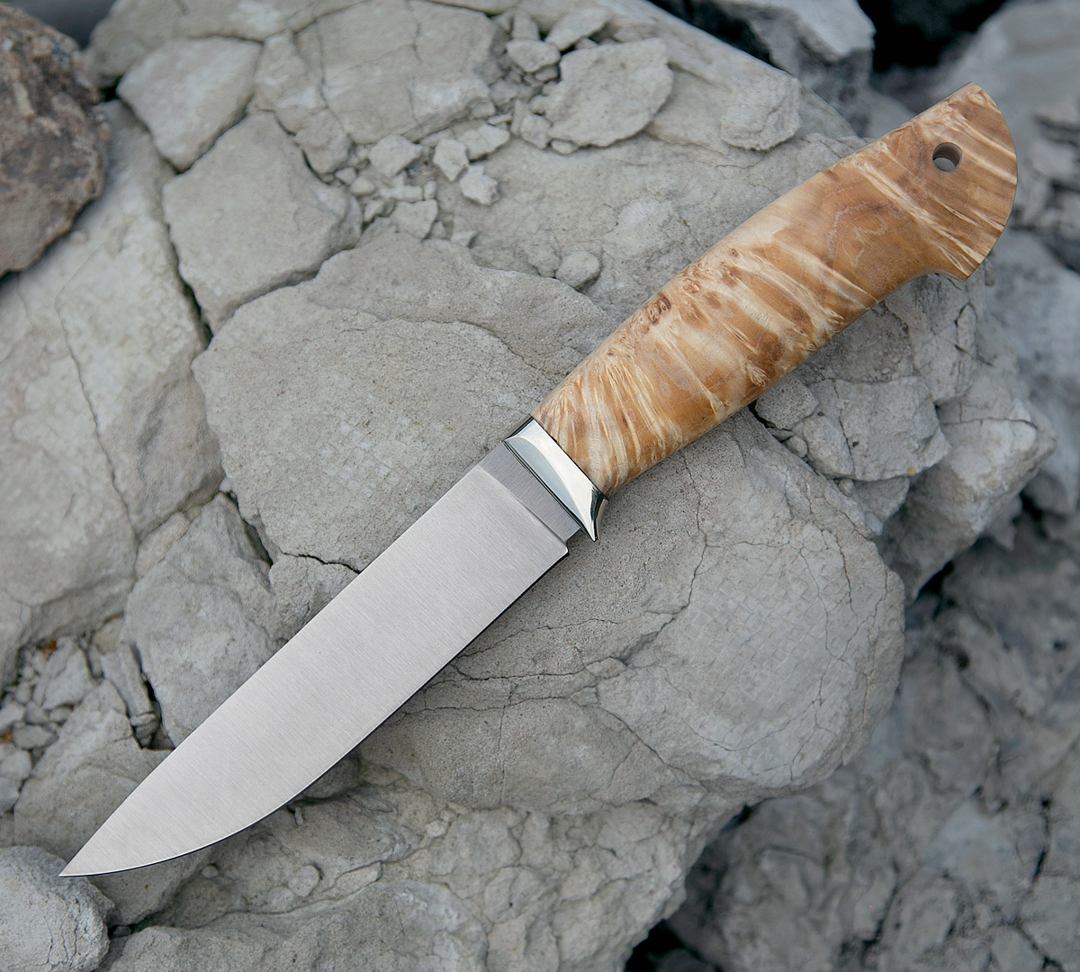 Нож Ладья из стали D2, рукоять - стабилизированная карельская береза, кожаный чехол идет в комплекте.