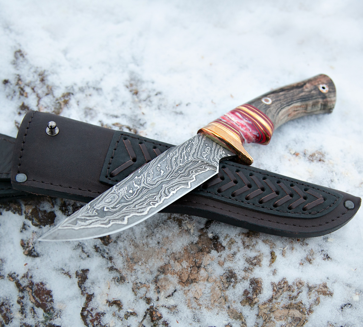 Нож Гефест из ламинированной стали, рукоять - стабилизированная карельская береза, зуб мамонта, мокуме. Кожаный чехол идет в комплекте.