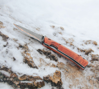 Нож складной Сибиряк из ламинированной стали, рукоять - стабилизированная карельская береза, кожаный чехол идет в комплекте.
